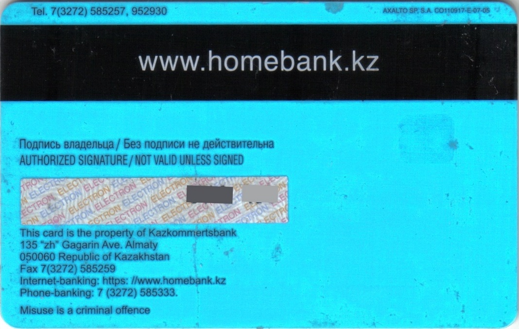 Год выпуска: 2005 МПС: VISA Уровень: Electron Описание: AXALTO SP, S.A. CO110917-E-07-05 ID №: 0000509